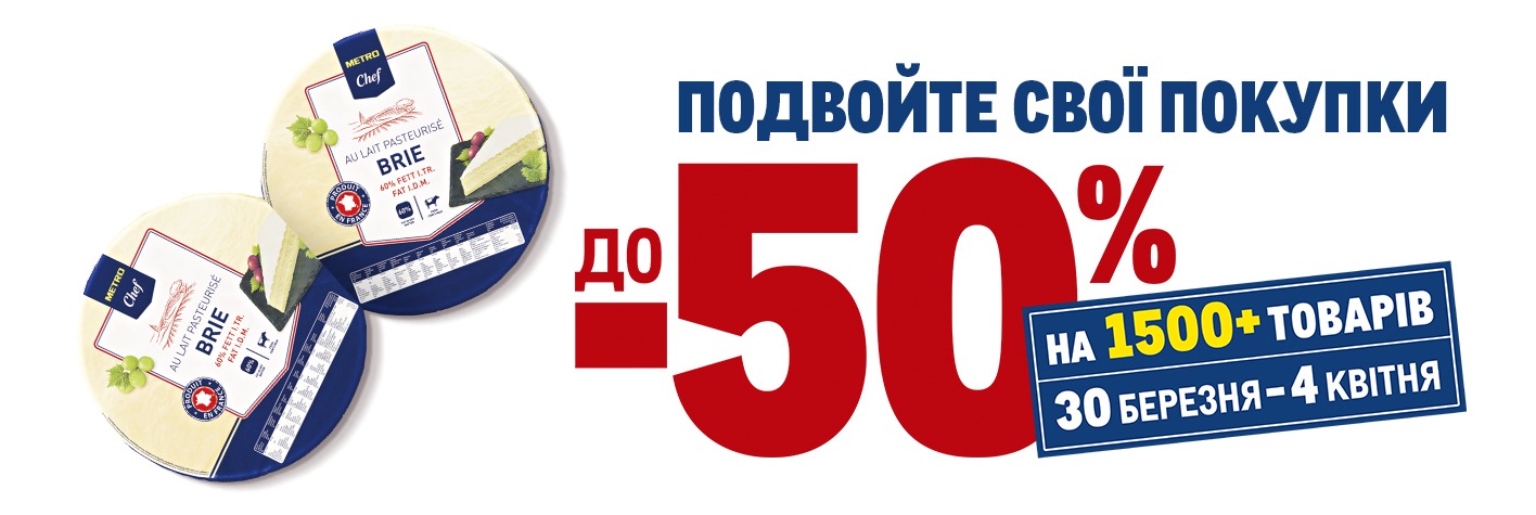 Відчуйте подвійну перевагу співпраці з METRO! Пропонуємо знижки до -50% на більше ніж 1500 товарів які допоможуть заощадити зусилля та кошти. Пропозиція для ХоРеКа клієнтів діє з 30 березня до 4 квітня.