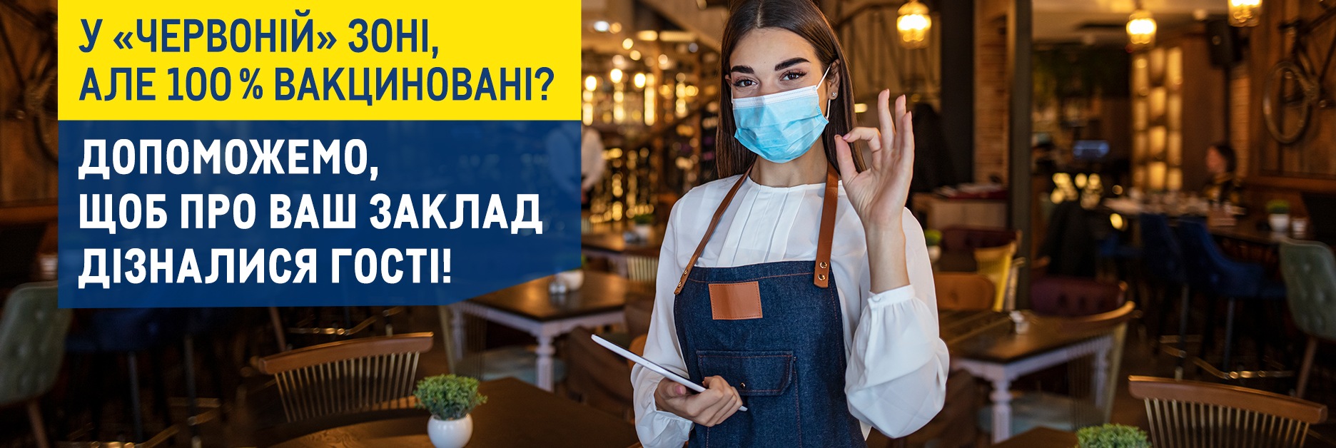 Якщо 100% вашого персоналу вакциновано і ви готові приймати відвідувачів, ми з радістю донесемо це до вашої потенційної аудиторії. А саме — безкоштовно розмістимо рекламу вашого закладу на нашому сайті і рекламою приведемо на неї ваших гостей. Для цього вам потрібно лише заповнити спеціальну форму заявки.